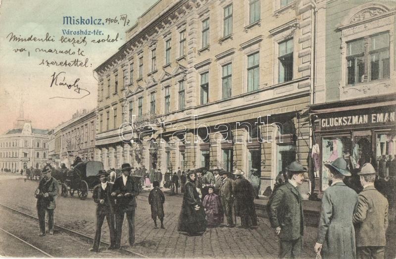 https://www.darabanth.com/en/30-Major-auction/30.1/Postcards/Hungary~12505/1906-Miskolc-Varoshaz-ter-Glukszman-Emanuel-uzlete-montazslap~II1853588