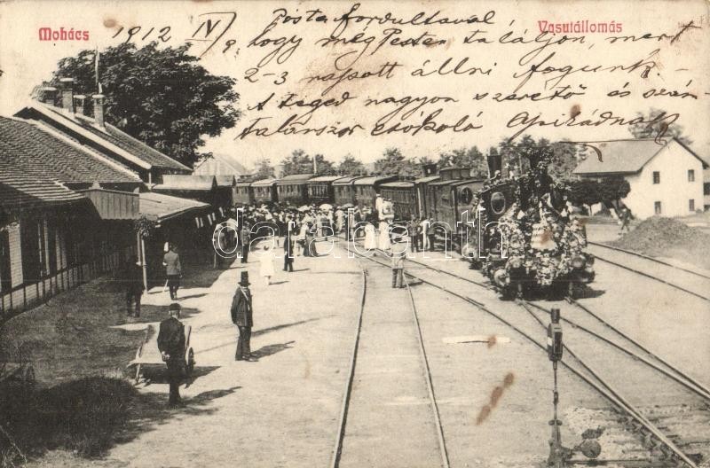 1912 Mohács, Vasútállomás feldíszített ünnepi gőzmozdonnyal. Bein és Weizer kiadása / railway station with decorated locomotive (kis szakadás / small tear)