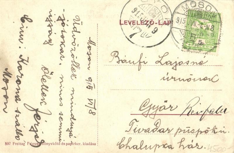 1915 Moson, Mosonmagyaróvár; Felső Fő utca, Ostermayer Károly Kisdedóvó Alapítványa, Leopold üzlete. Freitag Frigyes kiadása (EK)