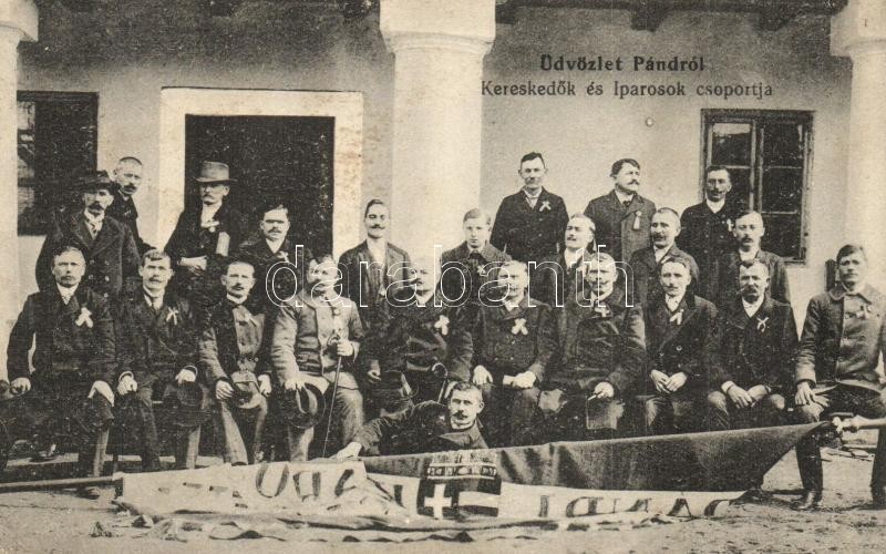 1915 Pánd, Kereskedők és iparosok csoportja zászlóval (EK)