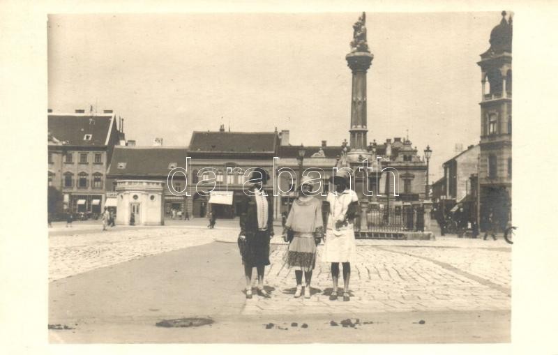 ~1920 Szombathely, Horváth Boldizsár tér, Szentháromság szobor, cukrászda, szabóság, Rosenfeld A. üzlete, három hölgy korabeli divatos ruhában. photo