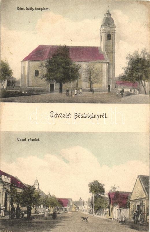Bősárkány, Római katolikus templom, utcakép, üzlet. Németh Viktor kiad...