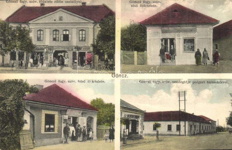Description: Gönc, Fogyasztási szövetkezet főüzlete a rőfös osztállyal, felső és alsó fióküzlete és vendéglője, polgári társaskör, Portland cement, mész és műtrágya raktár, Bencsik Sándor üzlete