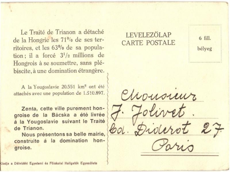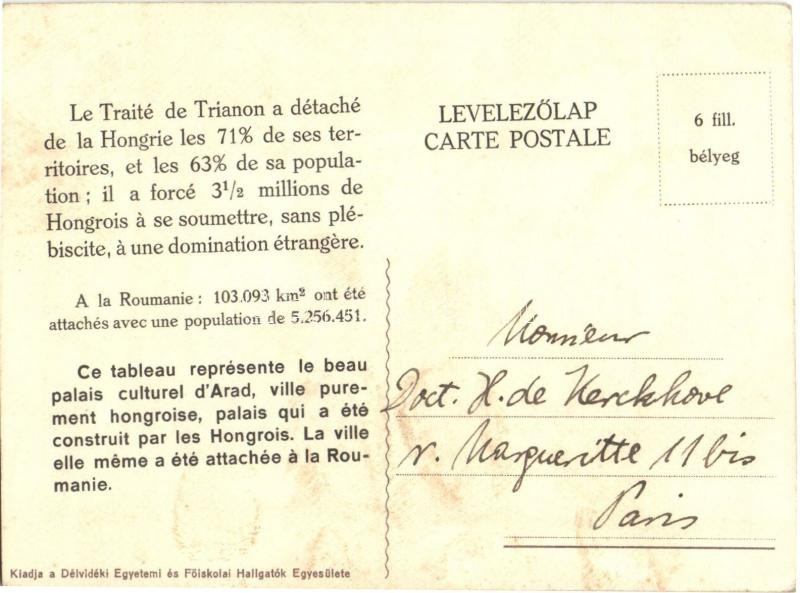 Description: 2 db RÉGI irredenta művészlap Lamoss szignóval, kiadja a Délvidéki Egyetemi és Főiskolai Hallgatók Egyesülete. Arad és Zenta / 2 pre-1945 Hungarian irredenta art postcards, Arad and Senta