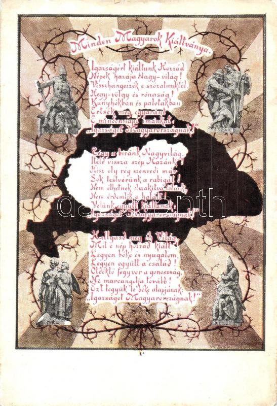 Description: Minden Magyarok Kiáltványa. M. kir. szab. sz. 2307/1935. Thienschmiedt Ede Hungária nyomdája, Kispest / Hungarian irredenta art postcard (gyűrődés / crease)