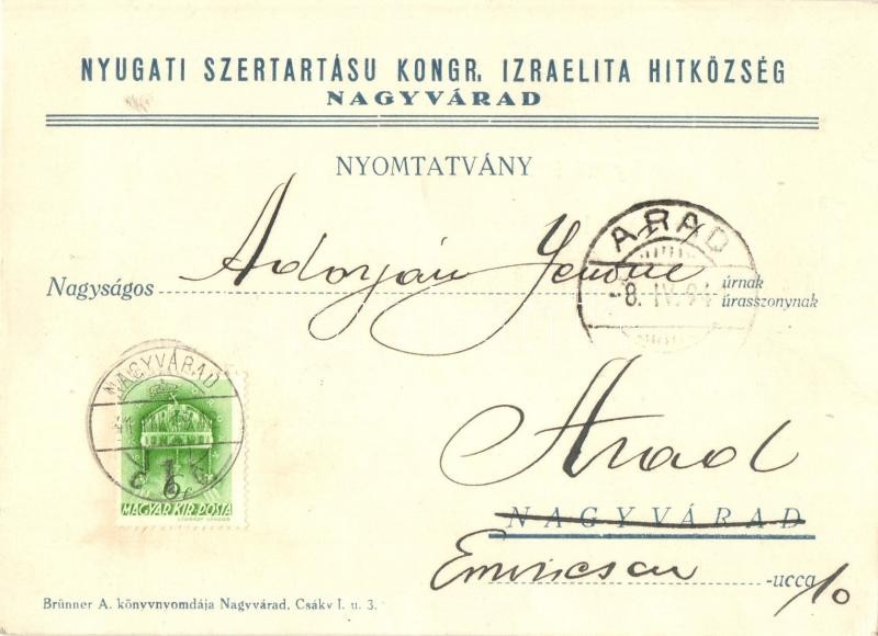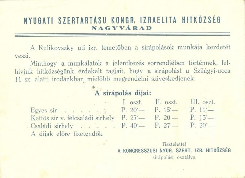 1941 Nagyvárad, Oradea; Nyugati Szertartású Kongr. Izraelita Hitközség... https://www.darabanth.com/en/30-Major-auction/30.1/Postcards/Judaica~12584/1941-Nagyvarad-Oradea-Nyugati-Szertartasu-Kongr-Izraelita-Hitkozseg-sirapolasi-osztaly-k~II1852313