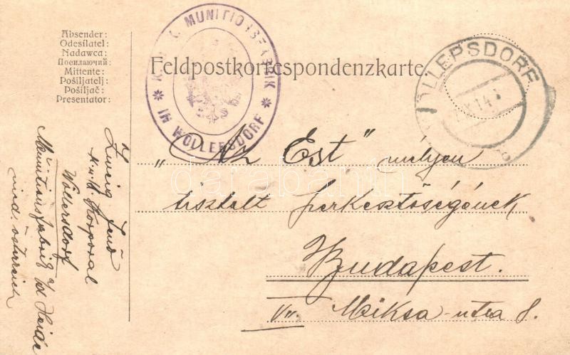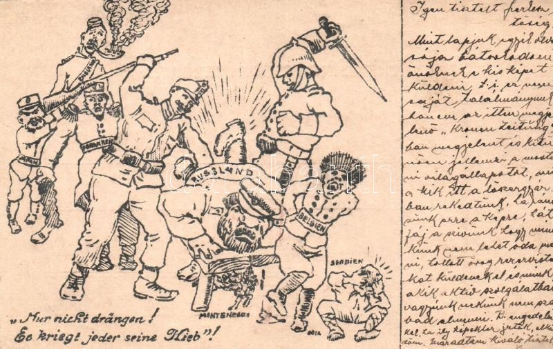 Description: 1914 Nur nicht drängen! Es kriegt jeder seine Hieb! / Antant-ellenes gúnyos művészlap. Kronen Zeitung-ban megjelent képeslap, érdekes írással! / WWI K.u.K. Anti-Entente Powers mocking art postcard + K.u.K. Munitionsfabrik in Wöllersdorf