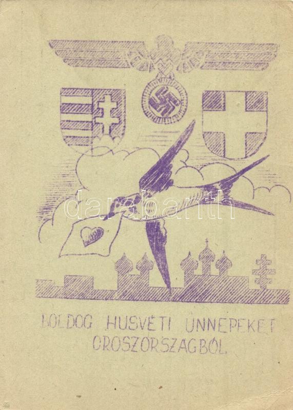 1942 Boldog Húsvéti Ünnepeket Oroszországból! Tábori Postai Levelezőlap/ WWII Hungarian military Easter greeting card from Russia, coats of arms, swastika (EK)