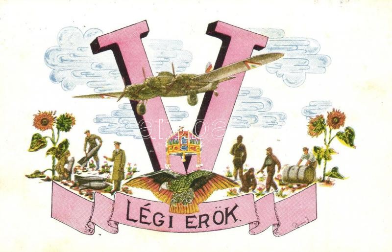 Description: Légi erők. Második világháborús hazafias magyar propagandalap repülőgéppel és pilótákkal / WWII Hungarian patriotic propaganda card with military aircraft and pilots s: B.J.