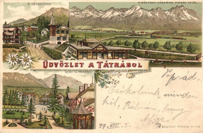 1897 (Vorläufer!) Tátra, Ótátrafüred, Központi Kárpátok Poprád felől, Alsó-Tátrafüred / Fatransko-tatranská oblast, Stary Smokovec, Dolny Smokovec. E. Benigny No. 368. floral, litho