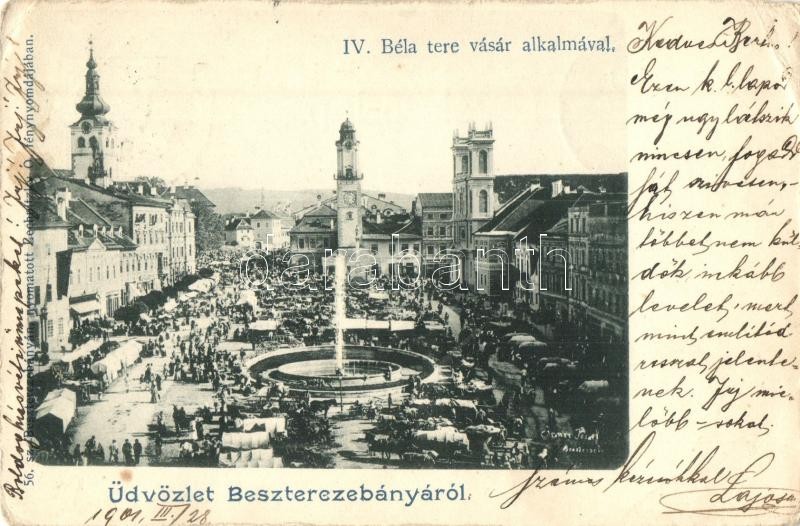 1901 Besztercebánya, Banská Bystrica; IV. Béla tér, piac, szökőkút / s...