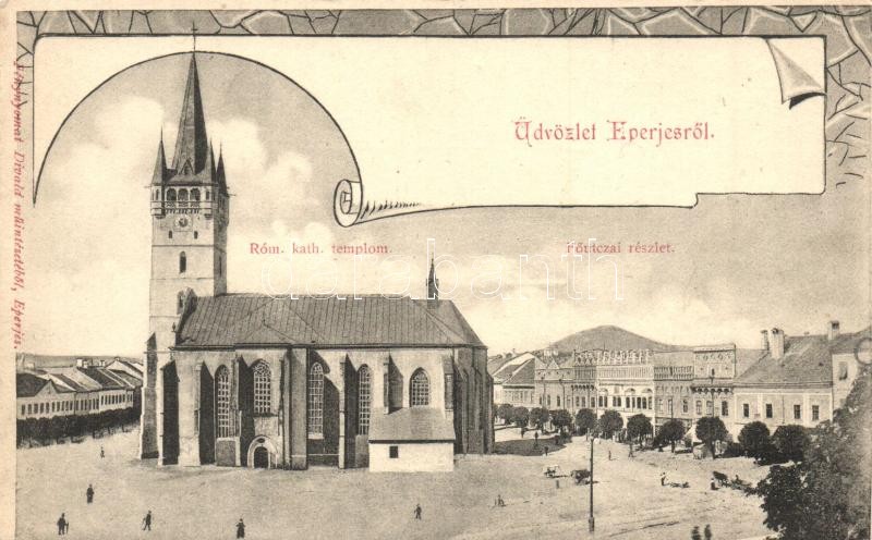 Eperjes, Presov; Római katolikus templom, Fő utcai részlet piaccal, Divald / church, main street with market, Art Nouveau (EK)