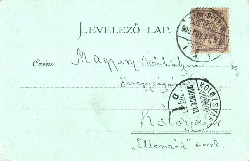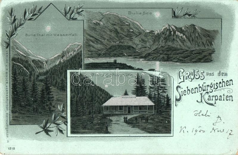 1900 Bólya, Bell, Bulia, Buia; Üdvözlet az Erdélyi Kárpátokból! völgy és vízesés, menház, tó. F. Binder kiadása / Grüss aus den Siebenbürgischen Karpaten! Bulia-Thal mit Wasserfall, Bulia-See, Bulia-Schutzhütte / Greetings form the Transylvanian Carpathians! valley, waterfall, rest house, lake. Art Nouveau, floral, litho (EK)