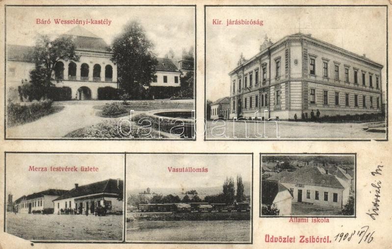 1908 Zsibó, Jibou; Báró Wesselényi kastély, Járásbíróság, vasútállomás, Állami iskola, Merza Testvérek üzlete / castle, court, railway station, school, shop (EK)