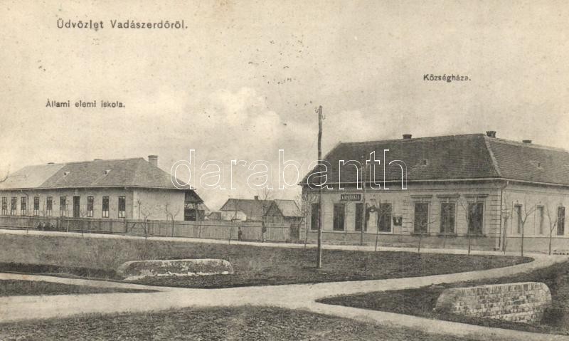 1910 Újszentes, Vadászerdő, Dumbravita, Santesti; (Temesvár); állami elemi iskola, községháza. Féhn A. Béla kiadása / school, town hall