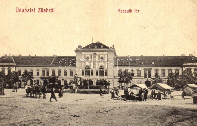 1911 Zilah Zalau; Kossuth tér, piac árusokkal, Vigadó szálloda, éttere...