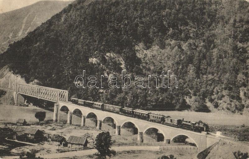 Description: 1915 Vöröstoronyi-szoros, Roterturmpass, Pasul Turnu Rosu (Nagyszeben, Hermannstadt, Sibiu); Magyar-román országhatár, vasúti híd gőzmozdonnyal. Karl Graef kiadása / Hungarian-Romanian border, railway bridge with locomotive