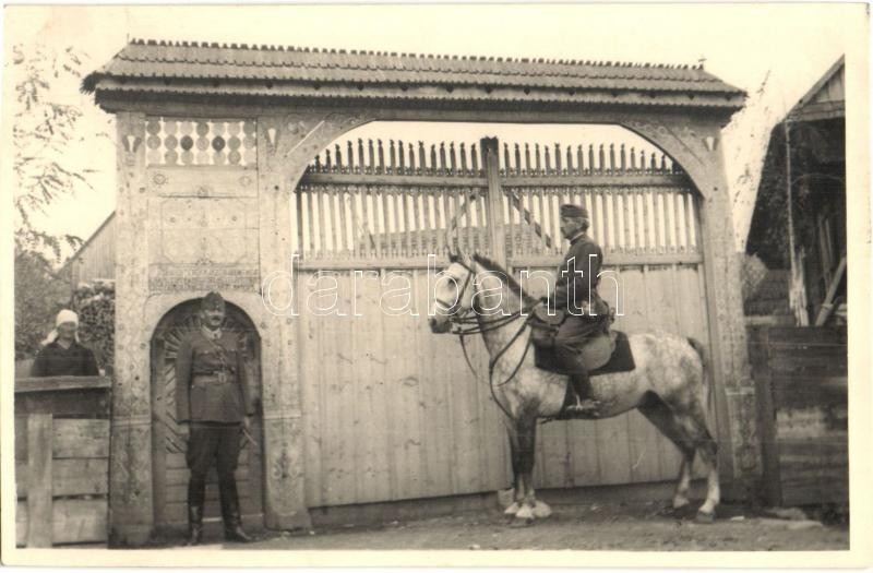 Description: 1940 Székelyföld, Tinutul Secuiesc; Bevonulás katonákkal a Székelykapu előtt. E kaput Isten segedelmével építtette Dénes és neje Botár Vilma 1934. / Poarta secuiasca / entry of the Hungarian troops on front of the Székely gate. photo