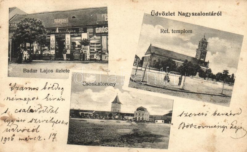 Nagyszalonta, Salonta; Csonkatorony, Református templom, Badar Lajos és Grósz üzlete / tower, church, shops (fl)