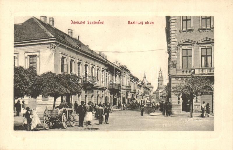 Szatmárnémeti, Szatmár, Satu Mare; Kazinczy utca, Fonciere biztosító, Scheiber üzlete. Hollósi felvétele / street, shops, insurance company