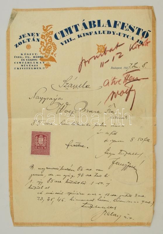 1927 Jeney Zoltán címtáblafestő díszes fejléces számla, okmánybélyegge...
