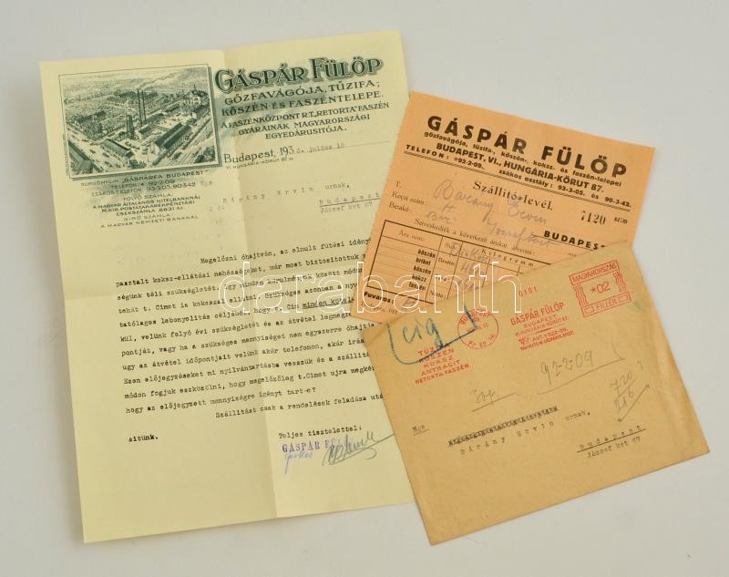 1933 Gáspár fülöp Gőzfavágója, Tűzifa-, Kőszén- és Faszéntelepének díszes fejléces levélpapírja, szállítólevele, borítékja