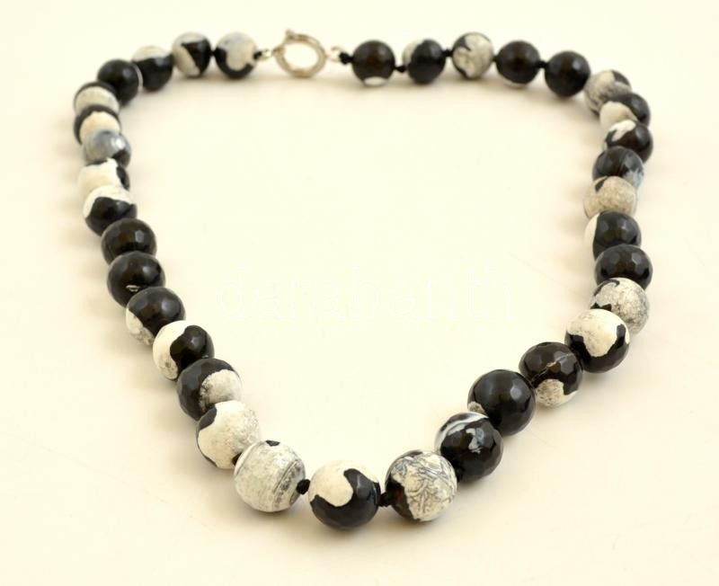 Fekete-fehér achát gyöngysor, h: 46 cm