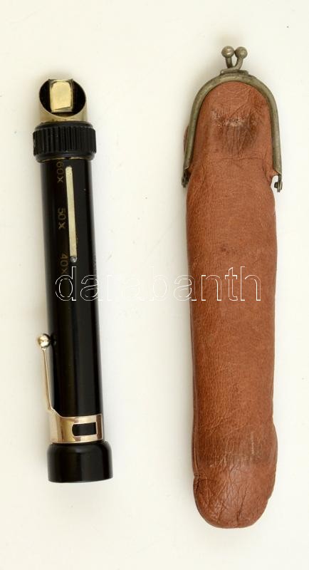 VLW Leichtmetall bélyegnagyító, bőr tokban, h: 12 cm./ VLW Leichtmetall stamp magnifier, in leather case, l: 12 cm.