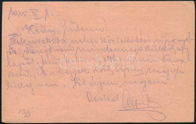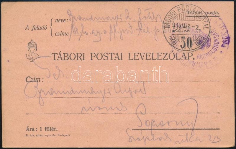 1915 Brandmayer (Bántay) Alfréd vezérkari kapitánynak, a 6. vegyesdandár parancsnokának saját kézzel írt tábori levelezőlapja