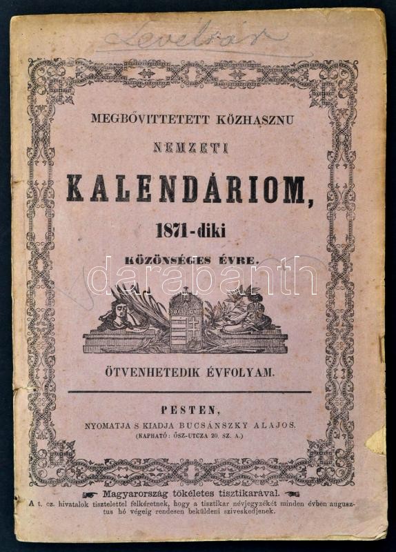 Description: 1871 Megbőnvittetett közhasznu Nemzeti Kalendárium, 1871 közönséges évre. Ötvenhetedik évfolyam. Pest, Bucsánszky Alajos Kiadói papírkötés, kissé szakadt borítóval, szamárfülekkel a lapokon, naptárbélyeg pecséttel a címlapon, de alapvetően jó állapotban.