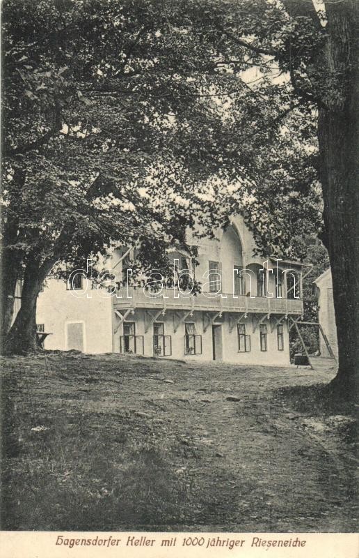 Description: Karácsfa, Hagensdorf im Burgenland; Keller mit 1000 jähriger Rieseneiche / pincészet az 1000 éves tölggyel. Josef Heger kiadása / cellar with a 1000 year old oak tree (EK)