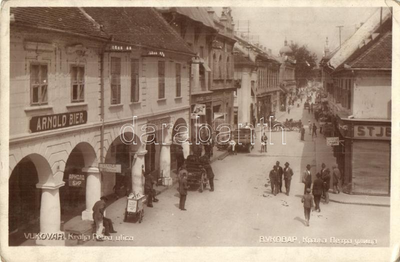 Vukovár, Kralja Petra ulica / utcakép, Arnold Bier üzlete, cipőbolt. L...