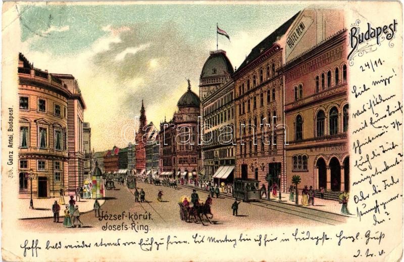 Description: Budapest VIII. József körút és Erzsébet körút, Hotel Rémi, Vígopera, Magyar királyi Technológiai és Ipar múzeum, villamos. Ganz Antal 309. litho (kis szakadás / small tear)