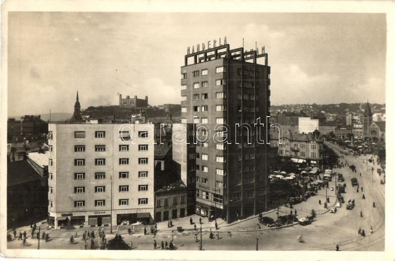 Pozsony, Pressburg, Bratislava; Manderla szálloda és kávéház, felhőkarcoló, automobilok, üzletek / hotel, grand café, skyscraper, automobiles, shops (EK)