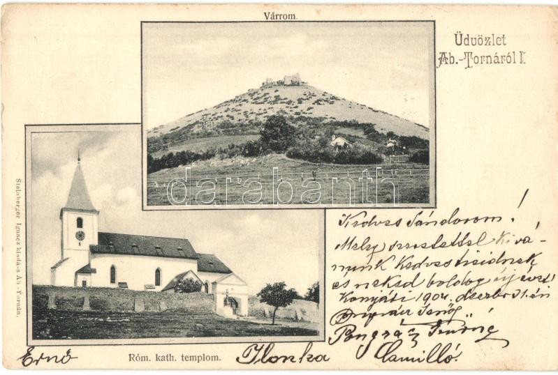 Torna, Abaúj-Torna, Turna nad Bodvou, Turnau; Várrom, Római katolikus templom. Steinberger Ignác kiadása / castle ruins, church (EK)