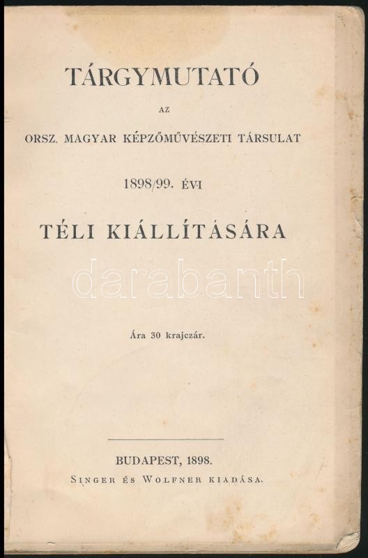Tárgymutató az Országos Magyar Képzőművészeti Társulat 1898/99. évi té... https://www.darabanth.com/en/301-Online-auction/301.0/Books/Books-Architecture-Art~400006/Targymutato-az-Orszagos-Magyar-Kepzomuveszeti-Tarsulat-189899-evi-teli-kiallitasara~II1613033