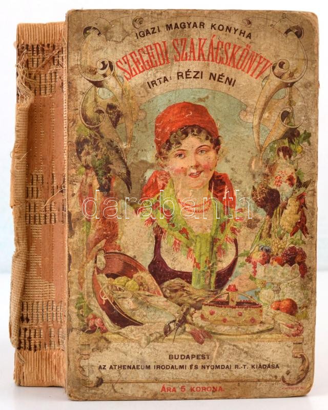 Rézi néni: Szegedi Szakácskönyv. Ezernél több ételkészítési utasítással. Bp., 1907, Athenaeum. Nyolcadik, javított és a legújabb ételreceptekkel bővített kiadás. Kiadói illusztrált félvászon-kötés, rossz állapotban, a borító hiányos, a hátsó borító és a gerinc hiányzik, az elülső borító kopott, a 477/478. oldal hiányzik, a 479-484. oldalak elváltak a gerinctől.
