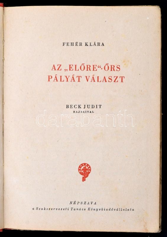 Fehér Klára: Az "Előre"-őrs pályát választ. Beck Judit rajzaival. Bp.,... https://www.darabanth.com/en/301-Online-auction/301.0/Books/Books-Other-rarities~400016/Feher-Klara-Az-Elore-ors-palyat-valaszt-Beck-Judit-rajzaival-Bp-1949-Nepszava-Kiado~II1615156