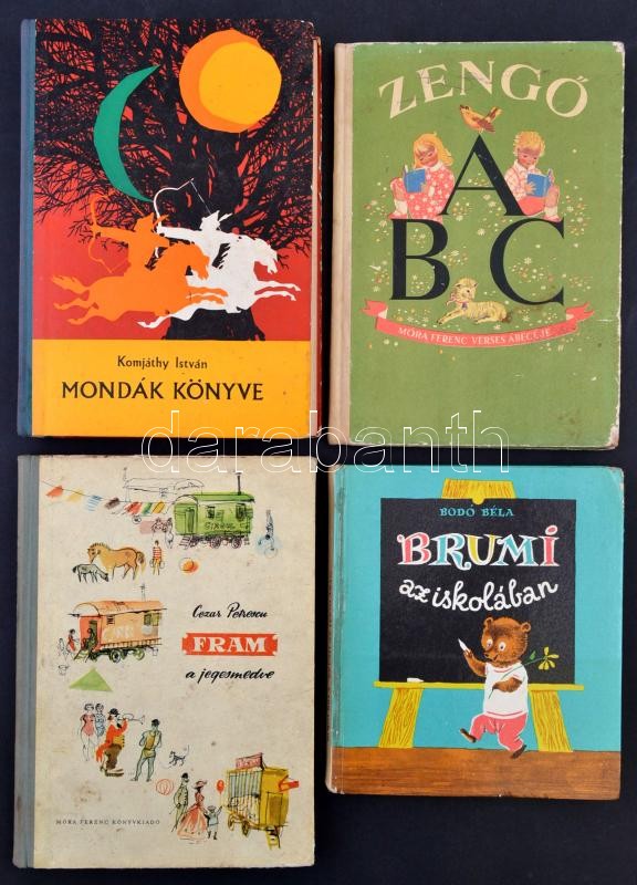 Vegyes könyvtétel, 4 db: Bodó Béla: Brumi az iskolában. Szávay Edit rajzaival. Bp., 1977, Móra. Negyedik kiadás. Kiadói kartonált papírkötés. Cezar Petrescu: Fram, a jegesmedve. Fordította: Réz Pál. Würtz Ádám rajzaival. Kiadói kartonált félvászon-kötés. Zengő ABC. Móra Ferenc verses ábécéje. Játékos olvasási gyakorlatokkal kiegészítette Justné Kéry Hedvig. Lukáts Kató rajzaival. Bp.-Uzsgorod,1977, Móra-Kárpáti. Kiadói kopottas félvászon-kötés. Komjáthy István: Mondák könyve. Boromisza Zsolt rajzaival. Bp., 1964, Móra. Harmadik kiadás. Kiadói félvászon-kötés.