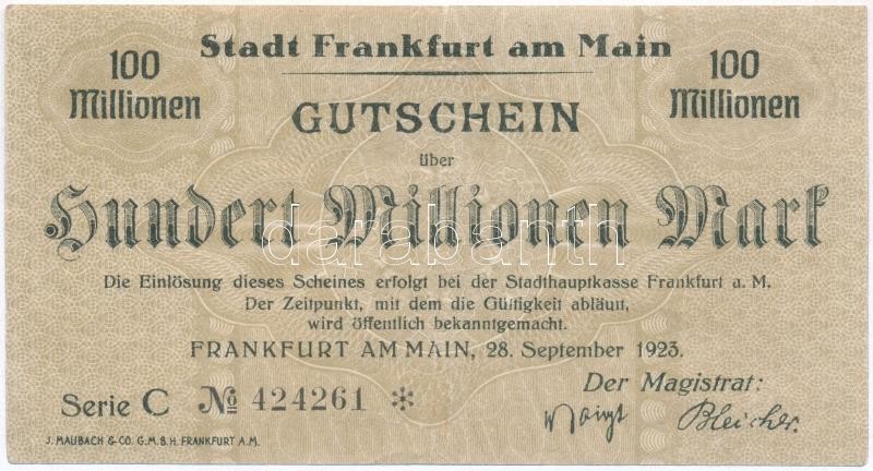 Description: Németország / Weimari Köztársaság / Frankfurt am Main 1923. 100.000.000M szükségpénz vízjeles papíron T:III
