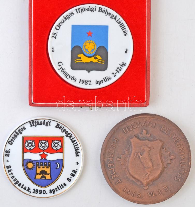 1987. "25. Országos Ifjúsági Bélyegkiállítás - Gyöngyös" jelzett hollóházi, festett porcelán plakett tokban (88mm) + 1989. "Ifjúsági Bélyegkiállítás - Kecskemét" kerámia plakett (97mm) + 1990. "28. Ifjúsági Bélyegkiállítás - Sárospatak" jelzett hollóházi, festett porcelán plakett "Hollóháza" papírtokban (88mm) T:1-,2