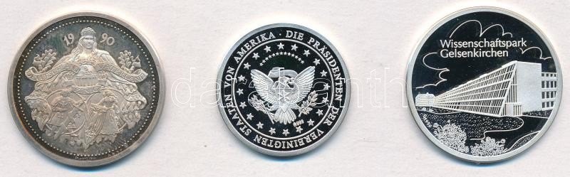 Németország 1990. "A Német Egység napja" jelzett Ag emlékérem (14,82g/0.999/35mm) + 1993. "Az USA elnökei - Bill Clinton" jelzett Ag emlékérem (8,44g/0.999/30mm) + 1997. "Gelsenkircheni Tudományos Park" jelzett Ag emlékérem (15,02g/0.999/35mm) T:PP,1 patina Germany 1990. "Tag der Deutschen Einheit" hallmarked Ag commemorative medal (14,82g/0.999/35mm) + 1993. "Die Prasidenten der Vereinigten Staaten von Amerika - Bill Clinton" hallmarked Ag commemorative medal (8,44g/0.999/30mm) + 1997. "Wissenschaftpark Gelsenkirchen" hallmarked Ag commemorative medal (15,02g/0.999/35mm) C:PP,UNC patina