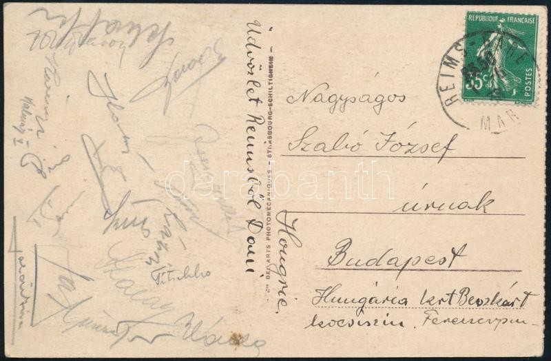 Description: 1938 A magyar labdarúgó válogatott tagjainak aláírása, többek közt Sárosi György (1912-1993) Zsengellér Gyula (1915-1999), Toldi Géza (1909-1985) Schaffer Alfréd (1893-1945) edző aláírásaival, a világbajnokságról, Reimsből küldött képeslapon / 1938 postcard from Reims signed by the Hungarian national football team
