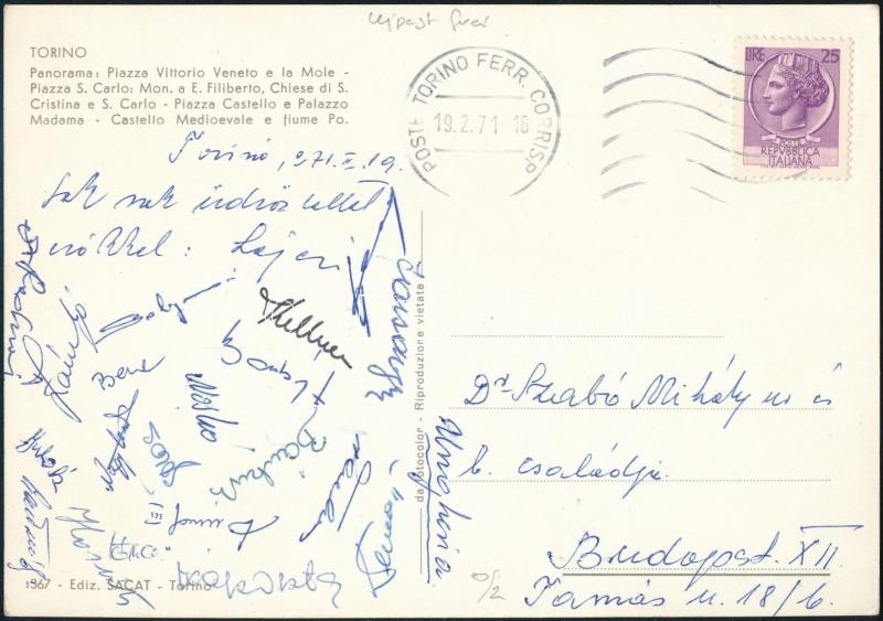1971 Újpest labdarúgó csapatának aláírása az Olaszországból hazaküldött képeslapon (Zámbó, Kellner, Szentmihályi, Sólymosi, Bánkuti, Farsáng, Bene, Gőröcs, Dunai II., Dunai III.)