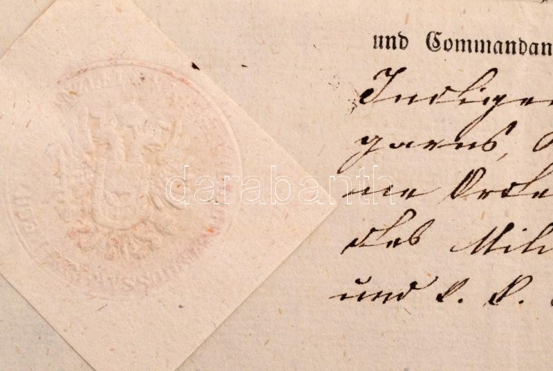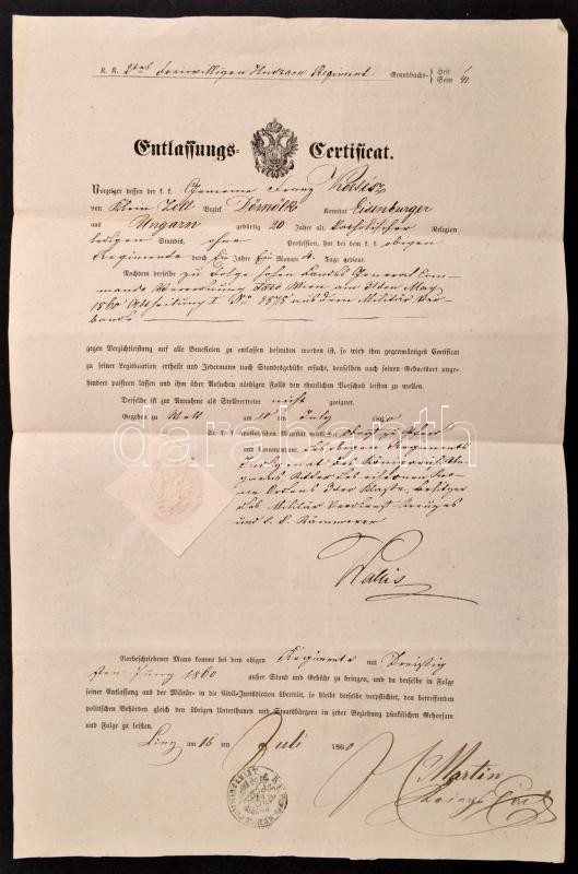 Description: 1860 Entlassungs-Certifiat. Elbocsátó bizonylat osztrák huszárezredben szolgált magyar katona részére, német nyelven, pecséttel, aláírásokkal, 44x28,5 cm