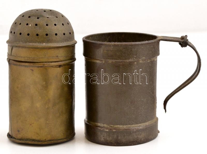 Régi fém italmérő (2dl), réz cukorszóró, horpadásokkal, m:8 és 10 cm