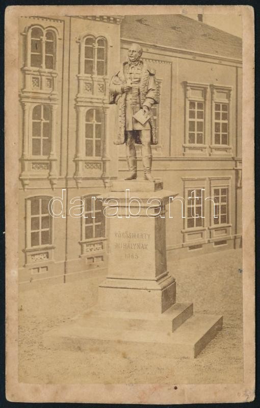 Description: cca 1870 Vörösmarty Mihály szobra, Székesfehérvár, fénynyomat, Pribék és Társa (Székesfehérvár), 10x6 cm. A székesfehérvári Vörösmarty Mihály szobrot, az országban elsőként, 1866 május 6-án avatták fel, Vay Miklós alkotása.
