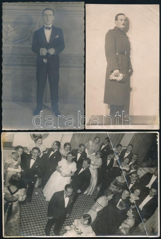 cca 1914-1936 Reisner Pál (?-1944) bankár, gyulai gyufagyáros fiának fotói, 3 db, az első világháborúból, egy ünnepi fotója a 30-as évekből, valamint a Jaschitz-bál egy fotója, rajta Reisner Pál és felesége is. Reisner Pál később 1944-ben meghalt munkaszolgálat közben, kettőn hajtásnyommal, 14x9 cm és 11x7 cm közötti méretben.