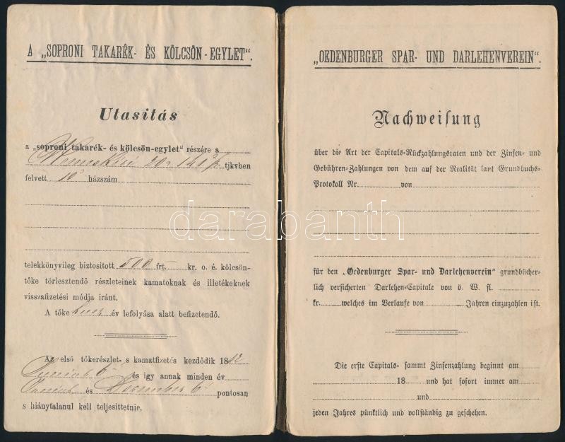 1802 Soproni Takarék és Kölcsön Egylet törlesztőkönyvecskéje. Papírkötés, magyar-német nyelven, bejegyzésekkel, viseltes állapotban, a borító kopottas, a lapok kijárnak.