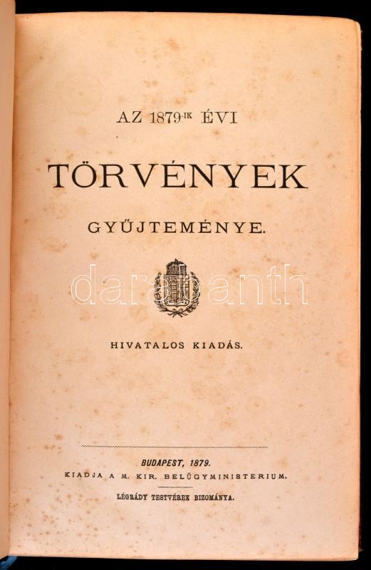 Az 1879-dik évi törvények gyűjteménye. Bp., 1879, M. Kir. Belügyminisz... https://www.darabanth.com/en/302-Online-auction/302.0/Books/Books-Law~500004/Az-1879-dik-evi-torvenyek-gyujtemenye-Bp-1879-M-Kir-Belugyminiszterium-Legrady-Testv~II1605158
